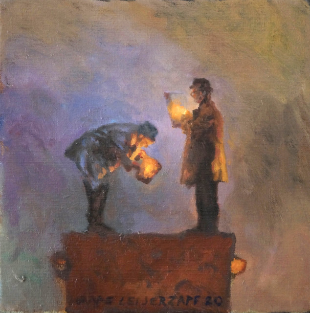 Het ziet er naar uit dat ze met iets bijzonders bezig zijn. Het lijkt een proef die ze nemen. Spelen met het licht of het vuur. De ene man wekt de indruk dat het gelukt is, maar de ander is nog niet overtuigd van het succes.