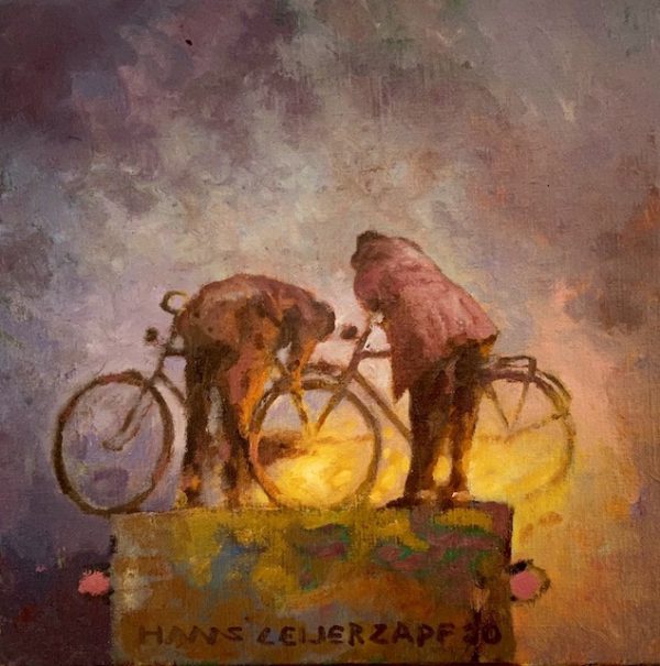 De één doet moeilijk, de ander kijkt belangstellend toe. Maar wat is er nu moeilijk? Het aan elkaar koppelen van twee fietsen zodat je met drie wielen kunt volstaan in plaats van de gebruikelijk vier wielen bij twee fietsen? Vast staat dat de toekijkende man vindt dat de ander moeilijk doet en zich er niet mee wil bemoeien.
