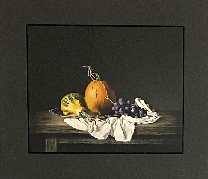Levensechte pompoenen en druiven liggen op een tinnen schaal waaronder een witte doek ligt. Een prachtige combinatie van kleuren, het geel van de pompoen en het paars van de druiven en het witte doek steken fraai af tegen de donkere achtergrond. Volop licht in dit schilderij.
