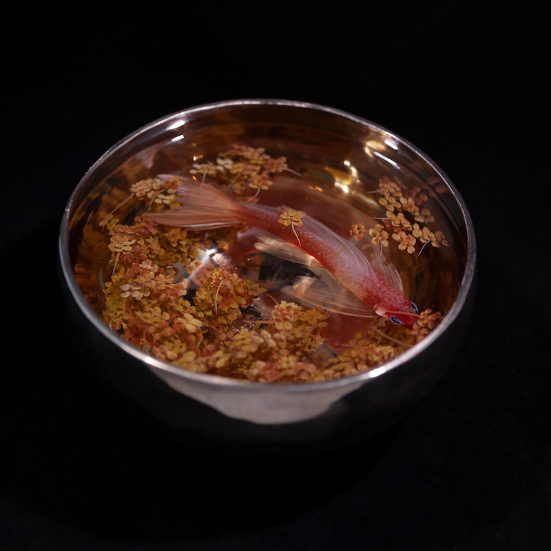 Vis (Koi) in een handgemaakte bronzen schaal uit Nepal. Zwemmend tussen planten. Geschilderd met acryl op 12 lagen epoxy.