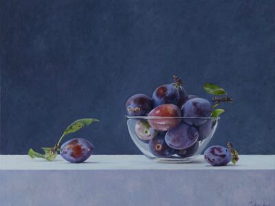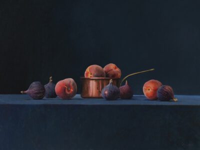 Een schilderij met witte aubergines, pruimen in een glazen schaal, walnoten met een kaasmal, en last but not least een stilleven met perziken en vijgen gedrapeerd rond een koperen pannetje.