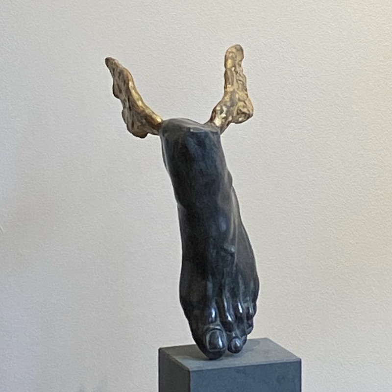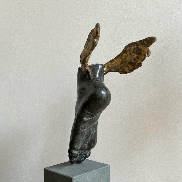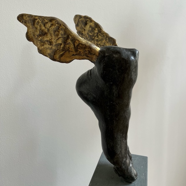 Materiaal: brons, vleugels met bladgoud beschilderd, sokkel van änröchter Grünstein