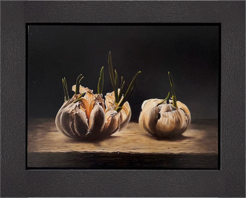 Een schitterend spel van licht en donker toont de pracht van de knoflook. De schaduwwerking versterkt dat beeld. De flinterdunne schil van de knoflook en de uitlopers komen sterk in beeld.