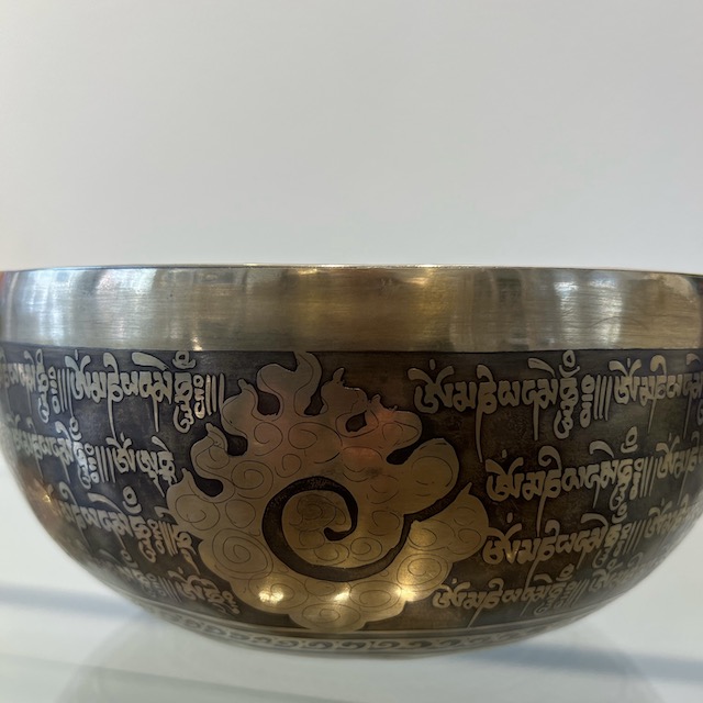 In een prachtige Nepalese klankschaal, voorzien van Nepalese teksten, is op 24 lagen epoxy een aantal vissen geschilderd. Ze lijken samen te zijn gekomen om zich te verwonderen over de ondergrond die, als er geen licht schijnt, een wat groene uitstraling te zien geeft.